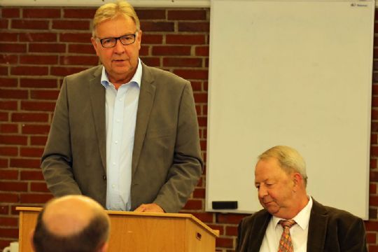 Ingolf Lind-Holm med generalforsamlingens dirigent, advokat Christian Dohn. Foto: Leif NielsenØstkraft på tværsIngolf Lind-Holm pegede direkte på Østkraft som årsagen til at projektet er sat på stand by, fordi det kommunalt ejede energiselskab inden den strategiske energiplan har været politisk behandlet, har vedtaget at ombygge Blok 6 til en træflisbasseret kraftvarmeproduktion.