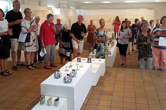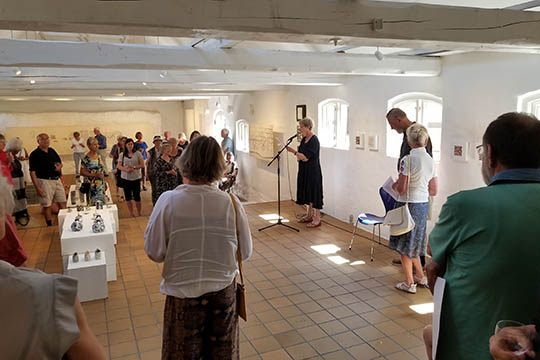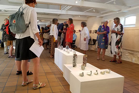- og Svanekegaardens tykke vægge sørgede for behagelig temperatur i sommervarmen.Samspillet mellem tekstilkunstneren og keramikeren er indlysende, mener Vibeke Eskesen, formand for Svanekegaardens Kunst- og Kulturforening.