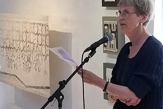 Charlotte Schrøder er en af Danmarks fineste gobelinvævere, og den over 70 år gamle kunstner udstiller sine store og små værker sammen med keramikeren Anne Stougaard, mens maleren og grafikeren Maria Thorsens tegninger udstilles for sig selv i teatersalens foyer.
