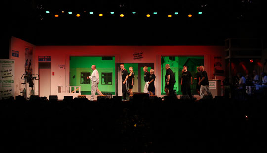 I Allinge er det uden rumsterstang. Til gengæld får publikum eftertrykkeligt banket fast, at øens populære førstedame, Winni Grosbøll er ”hjernen”, mens viceborgmester Steen Colberg Jensen er ”lanternen”…