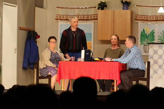 Der var udsolgt til komedien, der indledes med spisning i salen.I år spillede komedieholdet fra Østerlars Sport forestilling “Ægteskab og ambitioner, verdensmænd og landsbykoner”.