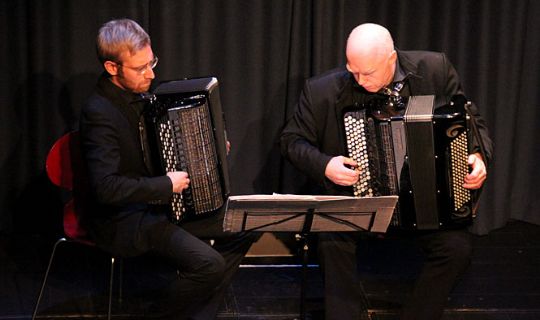Det kan man ikke sige om Duo Mythos' hænder. De for over tasterne på de to accordeoner. Og understregede dramatikken i det grusomme eventyr (der slet ikke var noget for de små børn i salen) og lyrikken i mellemspillene.