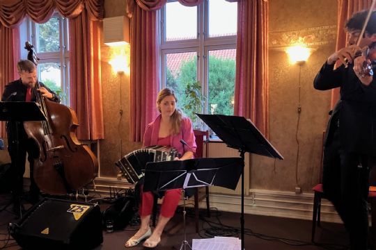 Lidt sær instrumentationStine Helkjær Engen er altså bandeonist, og hun blev akkompagneret af Mariano Flores González på keyboard, Luigi Coviello på kontrabas og Gonza Lesta Saraví på violin.
