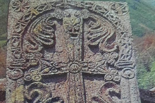 Kom Østen til Scandinavian?Når tegningen af tympanonen sidestilles med foto af en armensk korssten (khatchkar) fra 9. århundrede, kunne man tro, at vi havde haft besøg østfra, eller at en skånsk stenmester havde haft det. Ingen ved det, men hvorfor ikke; historien fortæller, at der i 11. årh. blev registreret tre armenske missionsbiskopper på Island.