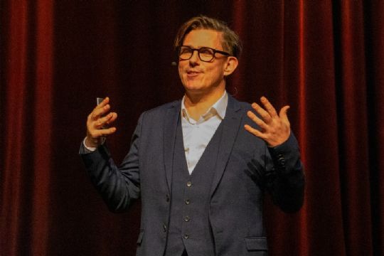 Niels Krøjgaard er psykologisk entertainer, med ekspertise i tankelæsning, psykologiske illusioner og mind control. Foto: Ole Sørensen / MusikhuzetSvindel og bedragFra første sekund Niels Krøjgaard gik på scenen, leverede han et show med en god blanding af svindel og bedrag, ægte psykologi og showmanship, der fik publikum til både at grine og gyse. Især de publikummer, der medvirkede på scenen.