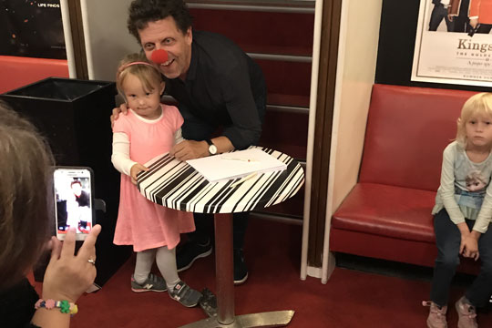 Skuespilleren Søren Hauch-Fausbøll var mødt op for at byde publikum velkommen. I Rønne Bios festpyntede foyer kunne man også møde et par klovne, der bød på gratis juice, slik og balloner til både børn og voksne.