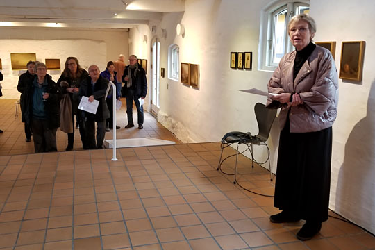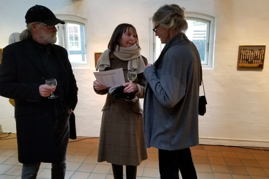 Ingrid Hansen (t.h.) kunne fortælle gæsterne om både sin afdøde mands kunst, men også sin egen, som også vises på udstillingen.