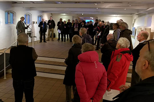 Formanden for Svanekegaardens Kunst- & Kulturforening Vibeke Eskesen havde de fremmødtes fulde opmærksomhed.Var censor på BornholmDan Thuesen var censor på Bornholms Censurerede Forårsudstilling 2017, og det var i den forbindelse, det lykkedes at overtale ham til at udstille på Svanekegaarden.