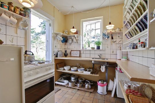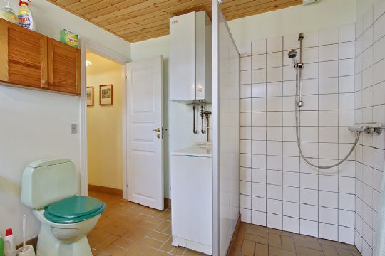 I stueplan er et mindre køkken med gaskomfur, køleskab, lille viktualiekælder, udgang til grunden og flot havudsigt. Der er mellemgang med klinkegulv og flot trappe til 1. sal, veranda, stue med klinkegulv, brændeovn, dobbelt skydedør til loggiaen, badeværelse med toilet, håndvask, bruseniche og vaskemaskine, samt gæstetoilet med håndvask.