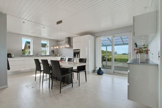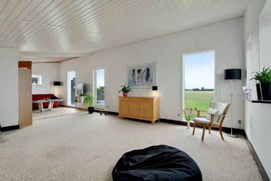 Huset indeholder entré med åben trappe til 1. sal, stort vinkelværelse, badeværelse, køkken-alrum med udgang til terrasse, to værelser og bryggers.