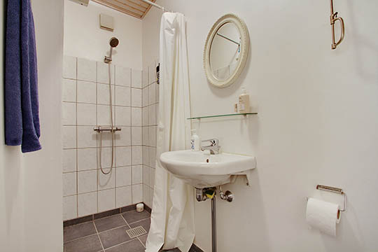 I stueplan er der en mindre lejlighed, som består af en stue, et værelse, et badeværelse og et lyst køkken.