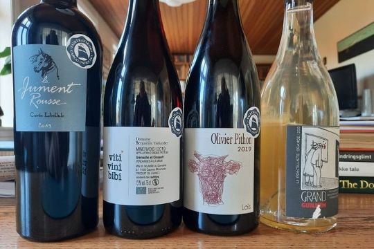Som foto viser, tog vi fire flasker med os hjem fra havnen, tre røde og en hvid.En af de hjembragte vine er Olivier Pithon La Laïs årgang 2019. Olivier Pithon blev involveret i vinproduktion, da han som barn hjalp familiemedlemmer i området Anjou i det vestlige Loire. Senere slog han sig ned som vinavler i Languedoc-Rousillon ved grænsen til Pyrenæerne og Spanien, der er meget forskelligt fra Anjou. Der er jordbær, krydderier og læder i næsen fra denne biodynamiske rødvin, der er producentens hovedvin, og som er lavet på druerne Grenache, Syrah, Mourvedre og Carignan.