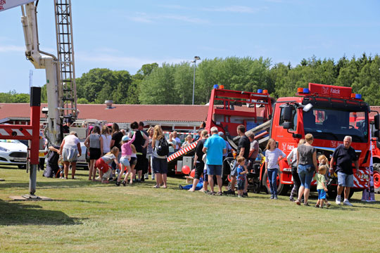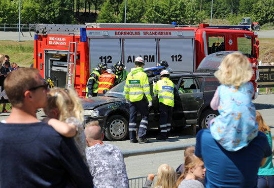 Blå blink kan altid trække mange mennesker til.Traditionens tro trak de ”blå blink” mange mennesker. Både brandvæsnets lift og ikke mindst ”trafikulykken” inde på travbanen, hvor en personbil kørte op bag i en parkeret bil – og en tilskadekommet person skulle klippes fri blev fulgt tæt. Brandbilen fra stationen i rønne samt en ambulance kom med horn og blink, så der var fuld opmærksomhed.