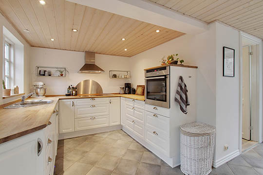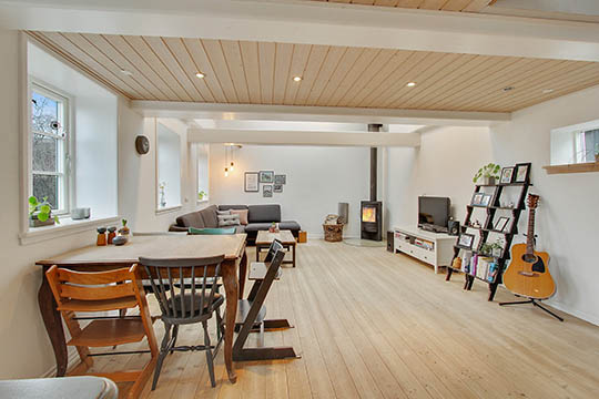 En del af stuen har loft til kip og fire store ovenlysvinduer i førstesals højde og der er brændeovnen. Stuens anden del ligger ved køkkenet, som kombinerer moderne løsninger med en rustik stil, og der er udgang til en fliseterrasse herfra, mens den tilstødende entré har udgang til en træterrasse.