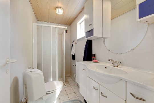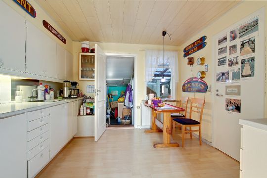 Huset indeholder vindfang, bryggers med håndvask samt fjernvarmeunit og nedgang til tørt kælderrum, køkken, soveværelse, stue med havudsigt, mellemgang og tidligere hovedindgang og badeværelse.