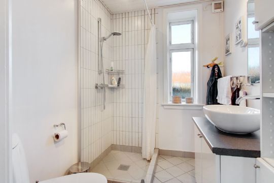 På 1. sal er repos med havudsigt, værelse med adgang til gæstetoilet med håndvask, gennemgangsværelse og børneværelse.