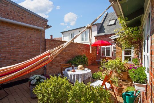 Fra mellemgangen er der udgang til hyggelig solrig gårdhave.