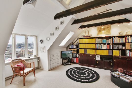 På første sal er der udsigtsstue, med loft til kip og loftsbjælker.