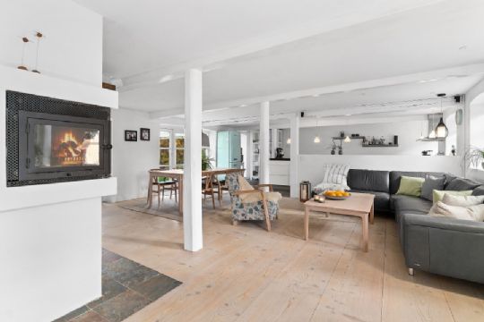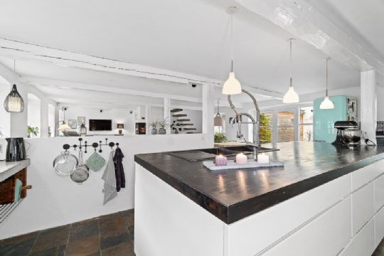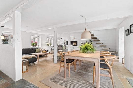 Ejendommen fra 1850 men der er overalt i boligen tilføjet moderne løsninger, der i sammenspil med de løbende istandsættelser giver huset en særlig atmosfære.