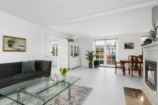 Villaen består af tre plan. Stueetagen har entré, gæstetoilet og bryggers samt køkken, stuer med pejs og dobbeltdøre til terrasse og have.