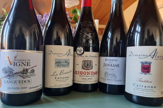 Hvis man har smagt de mest udbredte franske vine fra danske supermarkeder, kan man være heldig at opleve andre smagsnuancer i de vine, der købes fra andre vinimportører. Druer give ikke samme resultat alle steder, det afhænger af stedet hvor de gror, hvor begrebet terroir henviser til et sted men også til grostedets indflydelse på vinens smag. Feuille de Vigne, Gigondas og GSM (ikke vist) er fra COOP, mens Janasse og de to vine fra Alary er købt hos Jysk Vin.