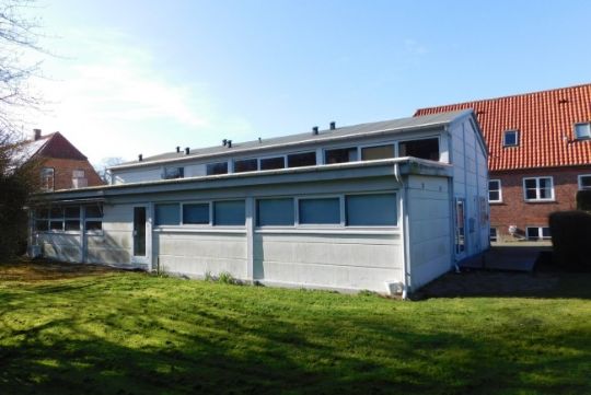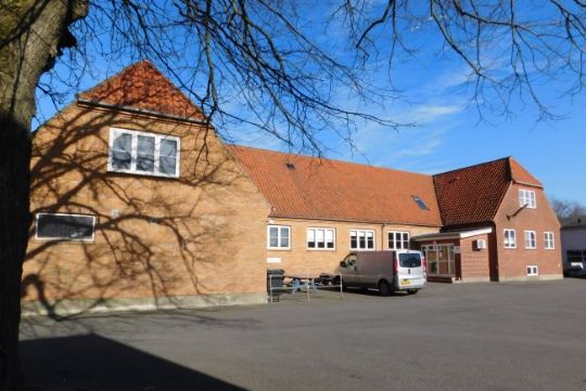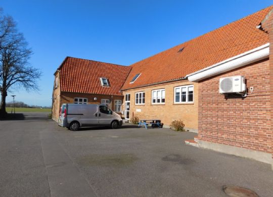 Bygningen har tidligere været byens forsamlingshus, men er nu en rummelig erhvervsejendom i to enheder med grønt areal og stor asfalteret parkeringsplads.