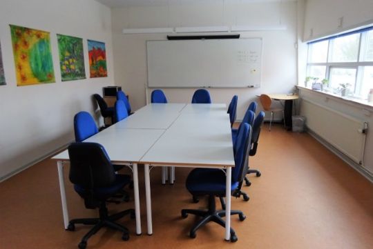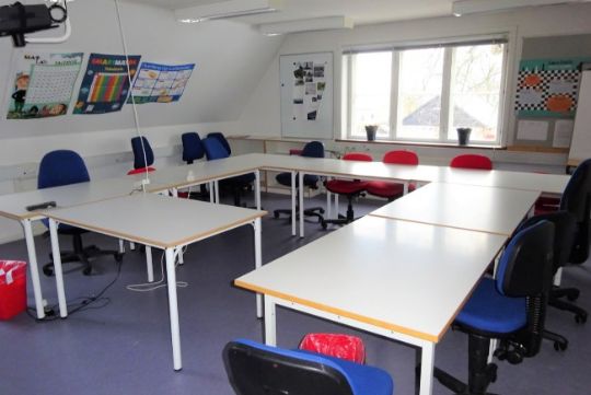På 1. sal er undervisningslokale og lærerkontor, møderum kontor og toilet.