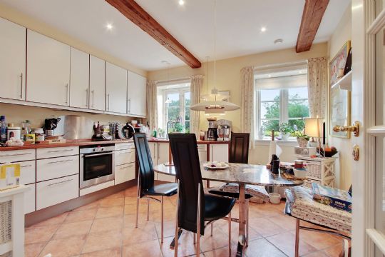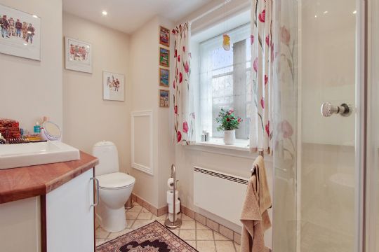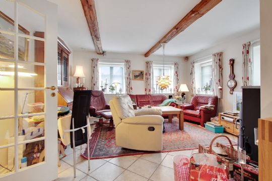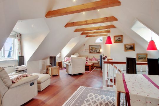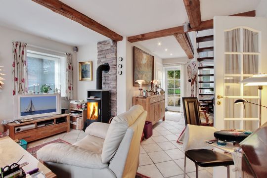 På 1. sal er to værelser og opholdsstue med brændeovn og synlige bjælker, og badeværelse.