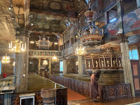 Fra det indre af ”trækatedralen” i Habo ved Vättern – malerier fra gulv til loft.