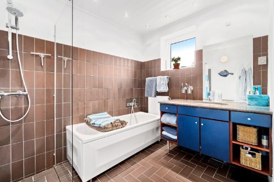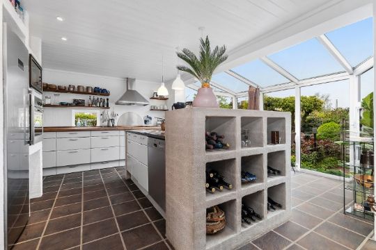 Boligens hjerte er et køkken-alrum, men der er også et praktisk bryggers og badeværelse med både badekar og bruseniche.