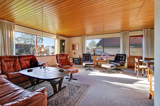 Vinkelstuen har en række store vinduespartier, så her både er et frit dagslysindfald og et ligeså frit udsyn til haven. Fra bryggerset er der praktisk tørskoet adgang til garagen.
