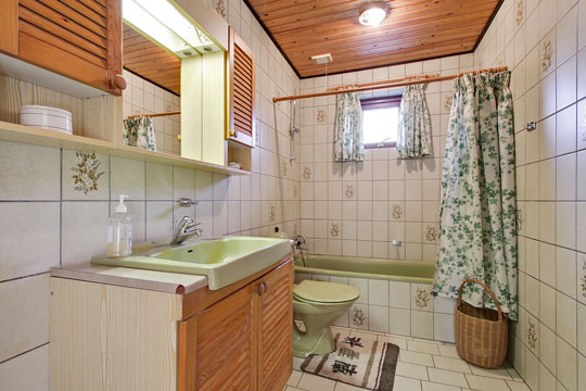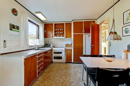 Køkkenet er det originale i teaktræ, og teaktræet går igen både i skabe og døre i hele boligen.