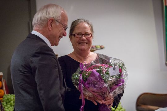 Birte Jensen fik mange blomster og rosende ord for det flotte arrangement - og kvitterede med et glas af den nye vin.