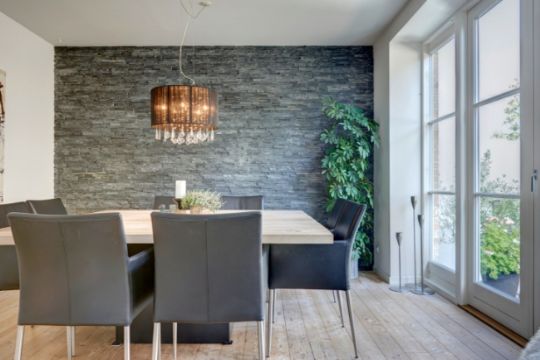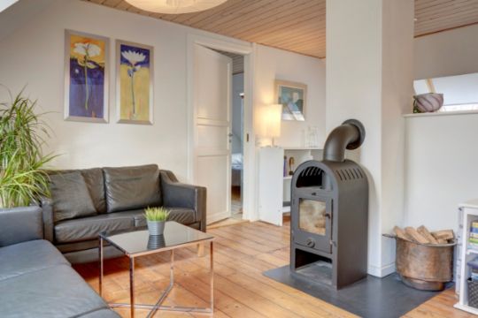 Der er desuden stort køkken/alrum med kogeø og glasparti til terrasse og gårdhave samt 4-fags stue med væghængt brændeovn.
