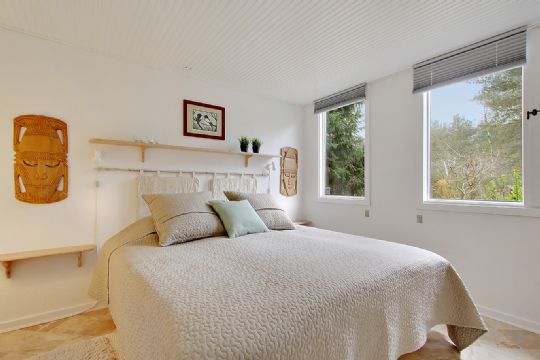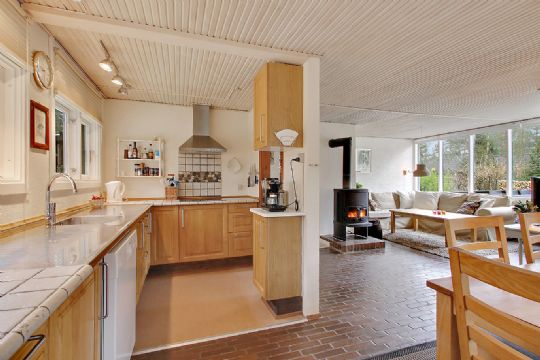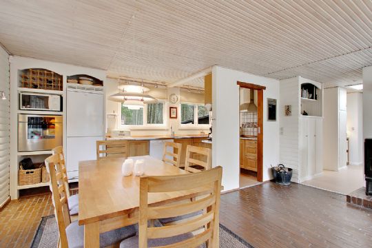 Huset indeholder entre og fordelingsgang, opholdsstue med brændeovn og åbent til køkken, flisebadeværelse, soveværelse og værelse med to sengepladser samt bryggers.
