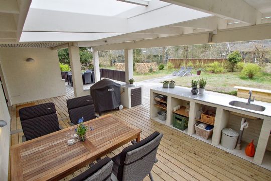 Der er stor sydvendt træterrasse, hvoraf den største del er overdækket og med udekøkken. Der er også carport og overdækket indgangsparti samt udhus og brændeskur.