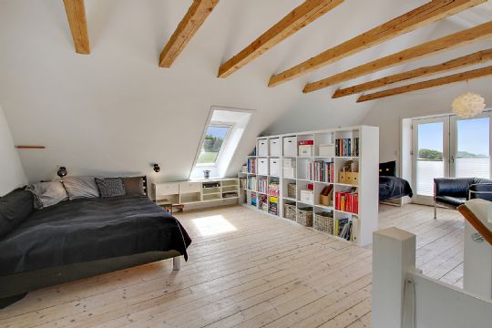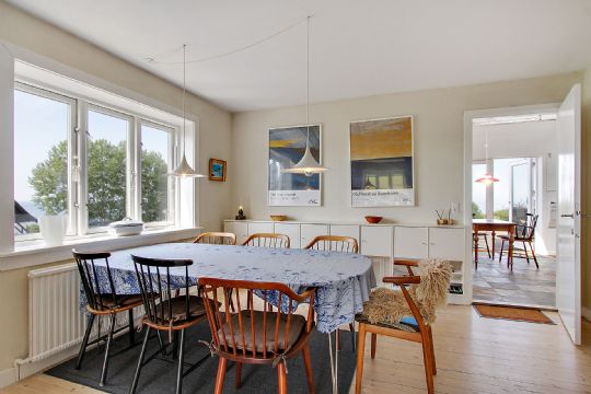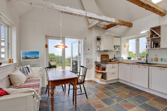 Boligen byder på 100 kvadratmeter med originale, hvidpigmenteret trægulve samt fritlagte bjælker og loft til kip på første sal og i køkkenet.