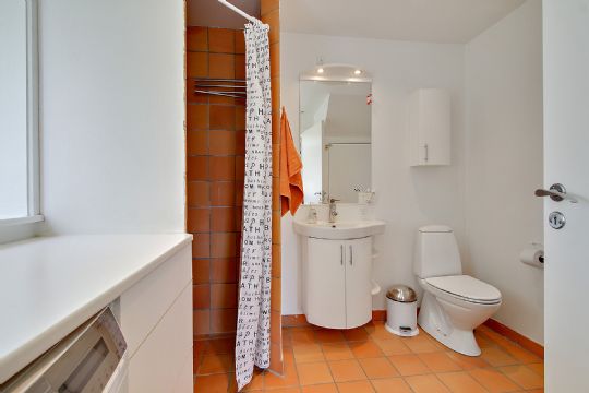 Derudover byder stueplan på et værelse og et funktionelt badeværelse med gulvvarme, bruseniche og vaskemaskine.