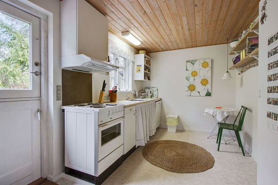 Huset indeholder køkken, spisestue, opholdsstue med brændeovn, mellemgang, badeværelse, soveværelse og stort værelse med fire sengepladser.