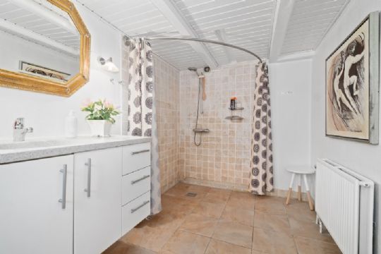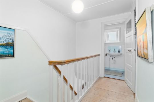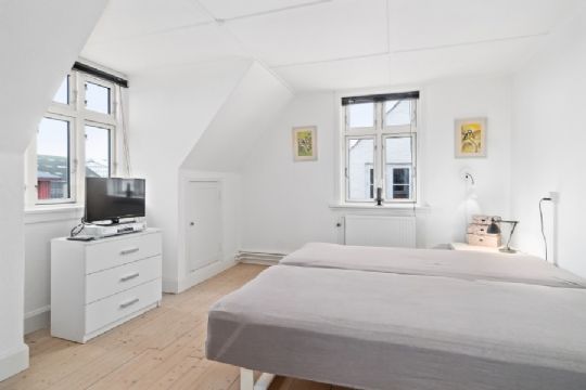 På førstesalen et to værelser og en repos med indbyggede skabe og et lille toilet.