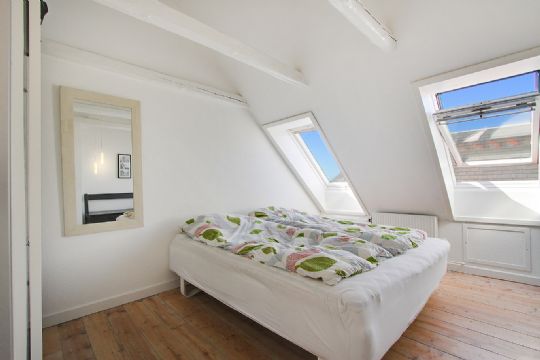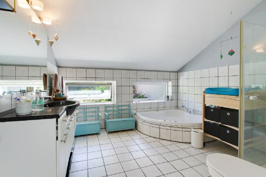 På 1. sal er der afhøvlede trægulve og flere værelser er bygget med loft til kip, synlige hanebånd samt med havkig.