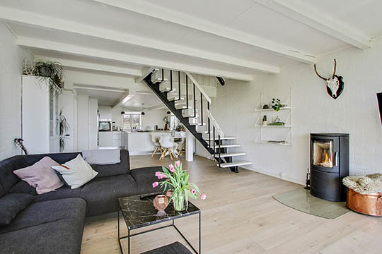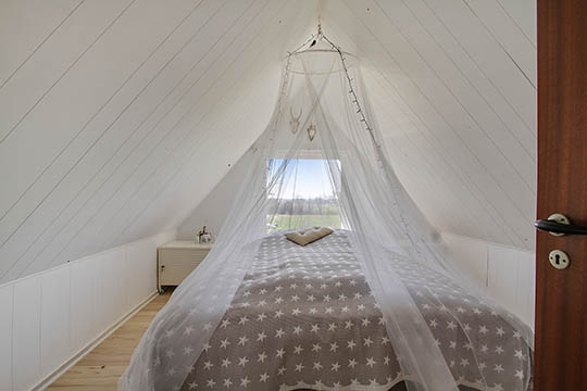 Fra køkken-alrummet er der opgang til førstesalen, der består af en repos og endnu et værelse. Der er mulighed for at lave flere værelser.