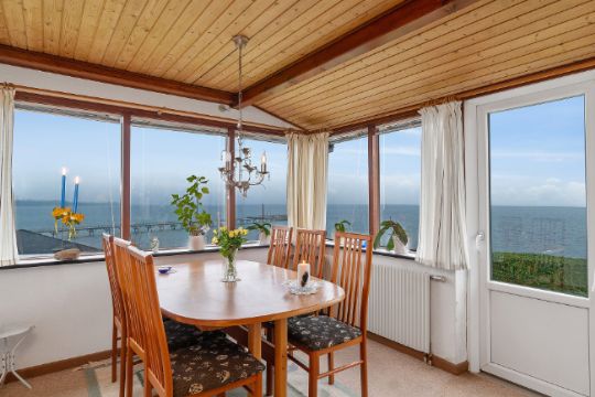 Fra villaen er der udsigt til Arnager Havn og til stranden, der strækker sig fra havnen og hen til bugten ved Sose Odde.