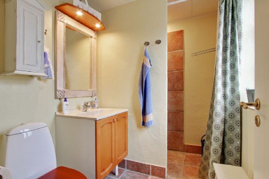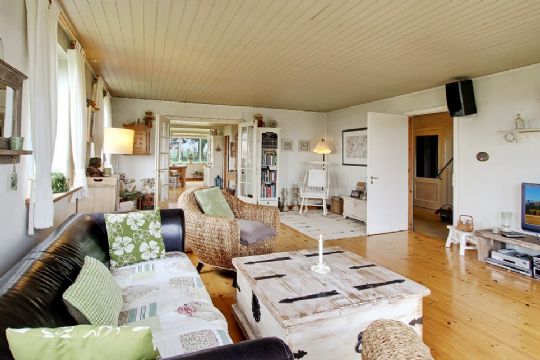 Beboelsen består af entre med trappe til 1. sal, køkken, hverdagsentre med opgang til 1. sal, badeværelse, to stuer en suite med udgang til terrasse, fyrrum og gildestue eller kontor med egen indgang.