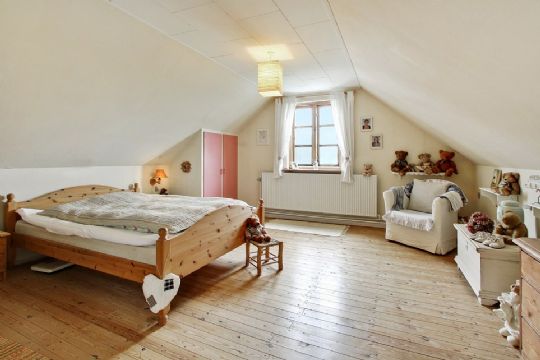 På 1. sal er stort soveværelse med skabe, fire børneværelser og toilet.