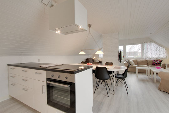 1. salen, der har egen udvendig afgang, men også adgang fra stueplan indeholder, opholdsstue i åben forbindelse med køkken, badeværelse, fordelingsgang og to gode værelser samt et mindre værelse.