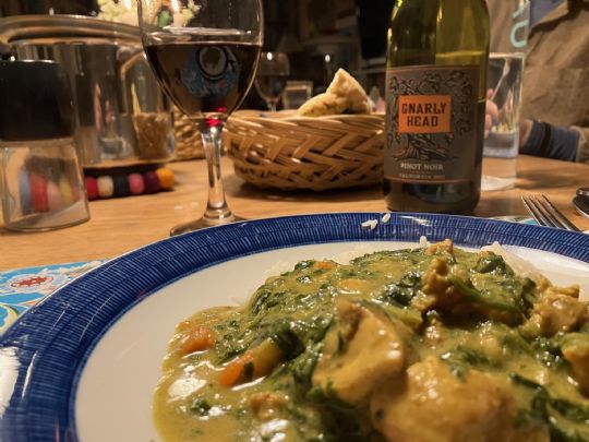 Til den kraftige gryderet med kylling, spinat, gulerødder og karry klarede Gnarly Head Pinot Noir fra Californien sig ganske udmærket.