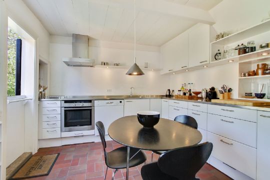 Huset er gulkalket med hvide sprossevinduer og røde tegl på taget. Til ejendommen er en helt unik have med port til gaden.