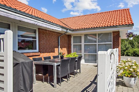 Ejendommen indeholder blandt andet entre, badeværelse, soveværelse, vinkelopholdsstue med udgang til stor fliseterrasse, to børneværelser, gæstetoilet, køkken/allrum, bryggers og overdækket indgangsparti.