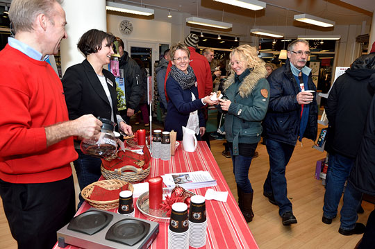 Kaffen og lækre hjemmebagte småkager sørgede Benny Schou og fru Charlotte Koefoed fra Hotel Balka Strand for i Bog & Ide - med hjælp fra boghandler Britt Skotte Petersen.”Jamen, det er jo herligt. Folk hygger sig. Det er en dejlig tradition. Jeg tror, her har været omkring 1.500 mennesker i aften. Måske flere,” lød det fra koordinator hos ErhvervsGruppe Øst Mikkel Skot-Hansen på Torvet.